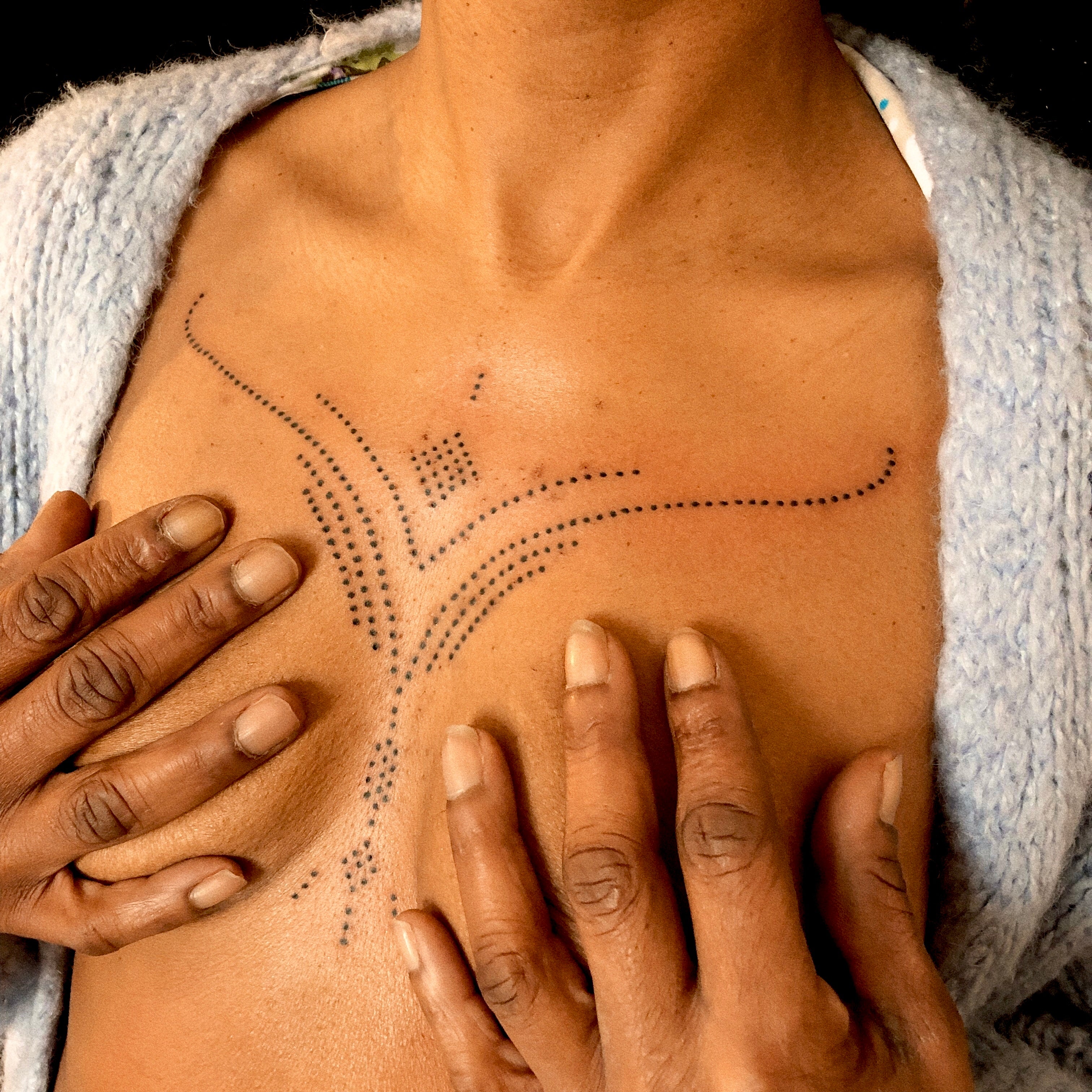 The design for your tattoo is directly drawn on your body in the flow of the moment. As I attune to your energy field and personal intention, I open myself up as a vessel to receive your design. This is a meditative and co-creative journey.